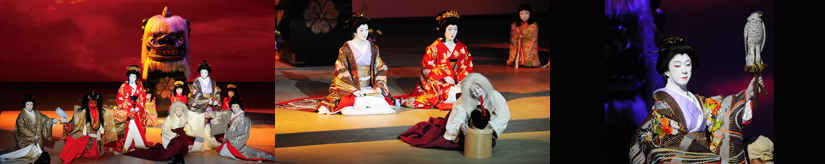 [左から]工人近江之丞桃六(片岡我當)、若き鷹匠姫川図書之助(市川海老蔵)、天守夫人富姫(坂東玉三郎) 平成21年7月歌舞伎座