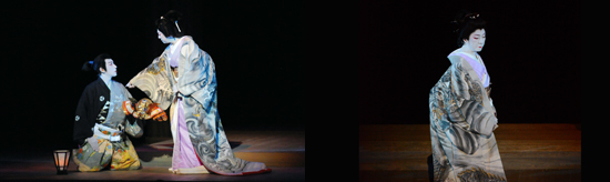 【左】[左から]若き鷹匠姫川図書之助(市川海老蔵)、天守夫人富姫(坂東玉三郎) 平成26年7月歌舞伎座