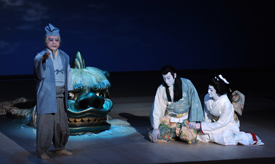 【中央】[左から]天守夫人富姫(坂東玉三郎)、岩代国猪苗代亀ヶ城亀姫(中村勘太郎)、亀姫眷属茅野ヶ原の舌長姥(市川門之助) 平成21年7月歌舞伎座