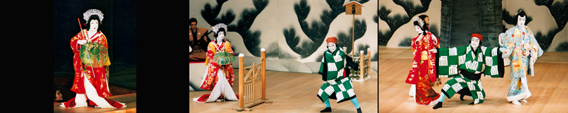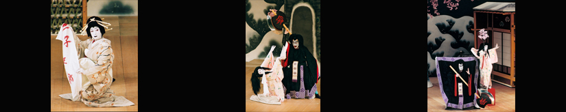 【右】[左から]小野小町姫(中村福助)、関守関兵衛実は大伴黒主(中村吉右衛門)、良峯少将宗貞(市川染五郎) 平成20年2月歌舞伎座