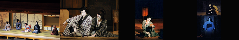 【左】[左から]後家お弓(市村萬次郎)、乳母おまき(中村歌女之丞)、喜兵衛孫娘お梅(尾上右近)、民谷伊右衛門(市川染五郎)、伊藤喜兵衛(市川團蔵) 平成25年7月歌舞伎座、