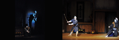 【左】[左から]民谷伊右衛門(市川染五郎)、四谷左門(松本錦吾) 平成25年7月歌舞伎座