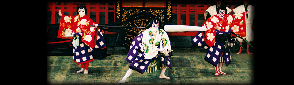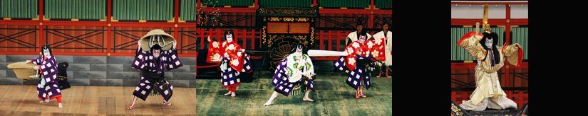 菅丞相に仕える白太夫には三つ子の男の子がいました。長兄の梅王丸は菅丞相に仕え、松王丸は藤原時平、桜丸は斎世親王に仕えています。しかし藤原時平の策略で菅丞相と斎世親王は失脚、その恨みを晴らさんと時平の牛車の前に梅王丸と桜丸が立ちふさがります。そこへ割って入ったのが松王丸。兄弟とはいえ一つではない、その忠義の働きをお目にかけようといいますが、車の中から時平が姿を現し、その恐ろしい姿にさすがの兄弟もすくみます。そして時平は松王の忠義に免じて助けてやろうといい、兄弟も父親の七十の賀の祝が済むまでは遺恨を預かろうと約束します。