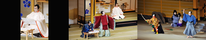 【右】[左から]菅丞相(片岡仁左衛門)、丞相伯母覚寿(坂東玉三郎)、苅屋姫(片岡孝太郎) 平成22年3月歌舞伎座