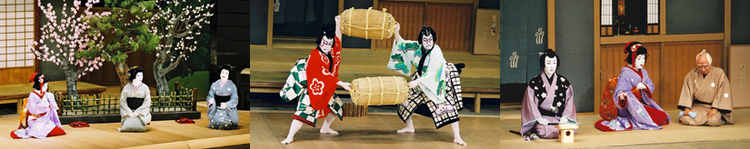 ここは草深い佐太村、三兄弟の父・白太夫が預かっている菅丞相の下屋敷。庭先には丞相が愛した梅・松・桜の木が植えられています。今日は白太夫の賀の祝で、すでに梅王女房の春、松王女房の千代、桜丸女房の八重が忙しく支度をしています。やがてやって来た梅王丸と松王丸は先日の遺恨から喧嘩となり、はずみで桜の枝が折れてしまいました。二人が去ったあと、入れ替わるように桜丸が姿をあらわします。その目の前に白太夫が差し出したのは腹切り刀。自らの行動が斎世ばかりか丞相までも不幸に追いやり、桜丸はすでに死への覚悟を決めています。やはり折れた桜がその行く末を暗示していたのです。