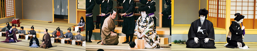 【左】[左から]源蔵女房戸浪(中村福助)、武部源蔵(坂東三津五郎)、涎くり与太郎(坂東亀寿) 平成25年5月歌舞伎座