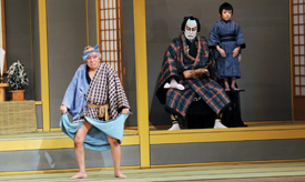 [from left]Matsuemon, actually Higuchi Kanemitsu(Nakamura Hashinosuke)、Gonshiro(Bando Yajuro)、Ofude(Nakamura Senjaku) August 2015 Kabukiza Theatre