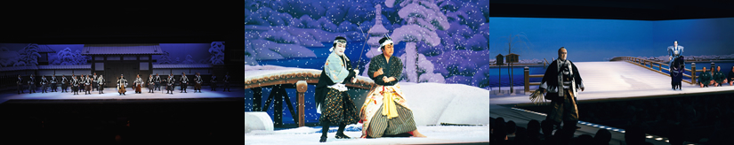 【Left】Opening November 2009 Kabukiza Theatre 【Center】[from left]Kaoyo gozen(Nakamura Kaishun)、Ko no Moronao(Nakamura Tomijuro)February 2007 Kabukiza Theatre 【Right】[from left]Momonoi Wakasanosuke(Nakamura Baigyoku)、Enya Hangan(Nakamura Kanzaburo)、Ko no Moronao(Nakamura Tomijuro) November 2009 Kabukiza Theatre