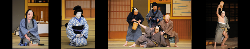 【Left】Sogoro the fishmonger(Onoe Kikugoro) May 2014 Kabukiza Theatre 【Center1】Onagi(Onoe Kikunosuke) October 2008 Kabukiza Theatre 【Center2】[from left]Sankichi(Bando Kametoshi)、Sogoro the fishmonger(Onoe Shoroku)、Ohama(Nakamura Shibajaku)、Tahei(Kataoka Ichizo) May 2010 Shinbashi Enbujo Theatre 【Right】Sogoro the fishmonger(Onoe Kikugoro) November 2011 Shinbashi Enbujo Theatre