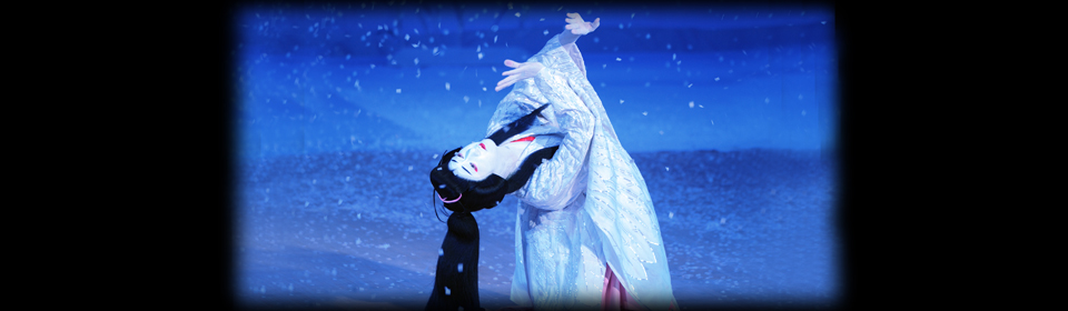 A young girl in a pure white kimono appears on a snow-covered set, looking like a heron that has just alighted. The lyrics compare the girl’s emotions to the snow piling on her umbrella, speaking of her love as delicate snowflakes inexorably melting away. They sing sadly of unrequited love, and the girl’s true identity as a heron is suggested by gestures such as her graceful arm movements.